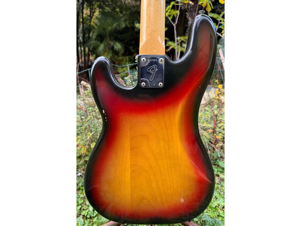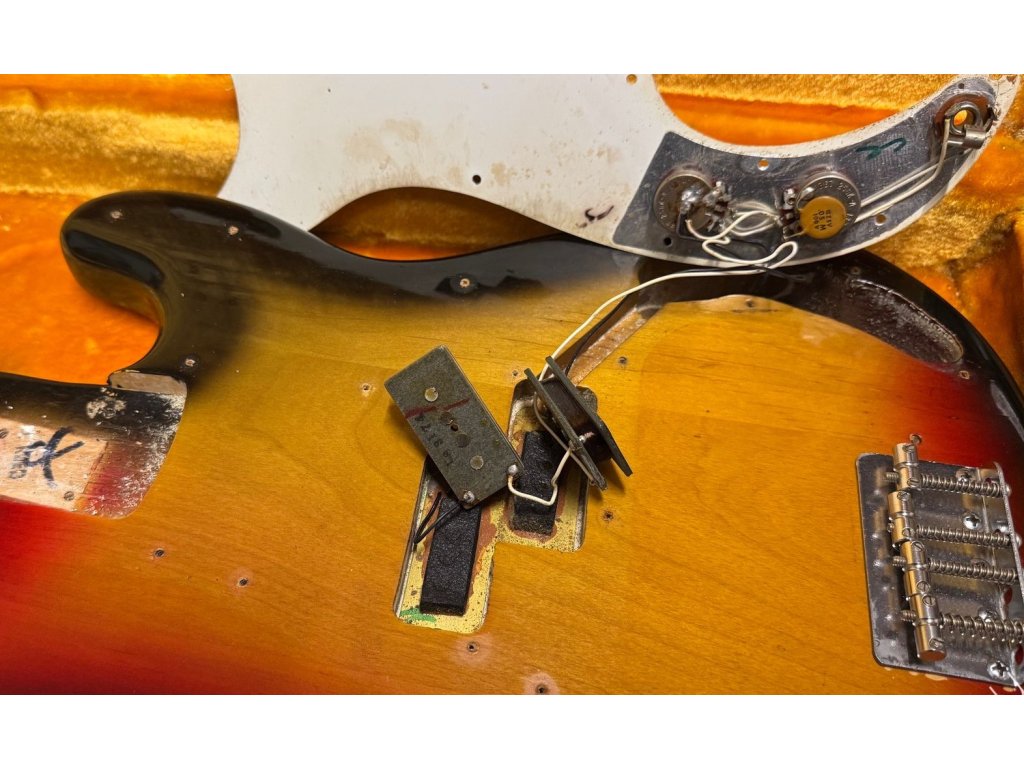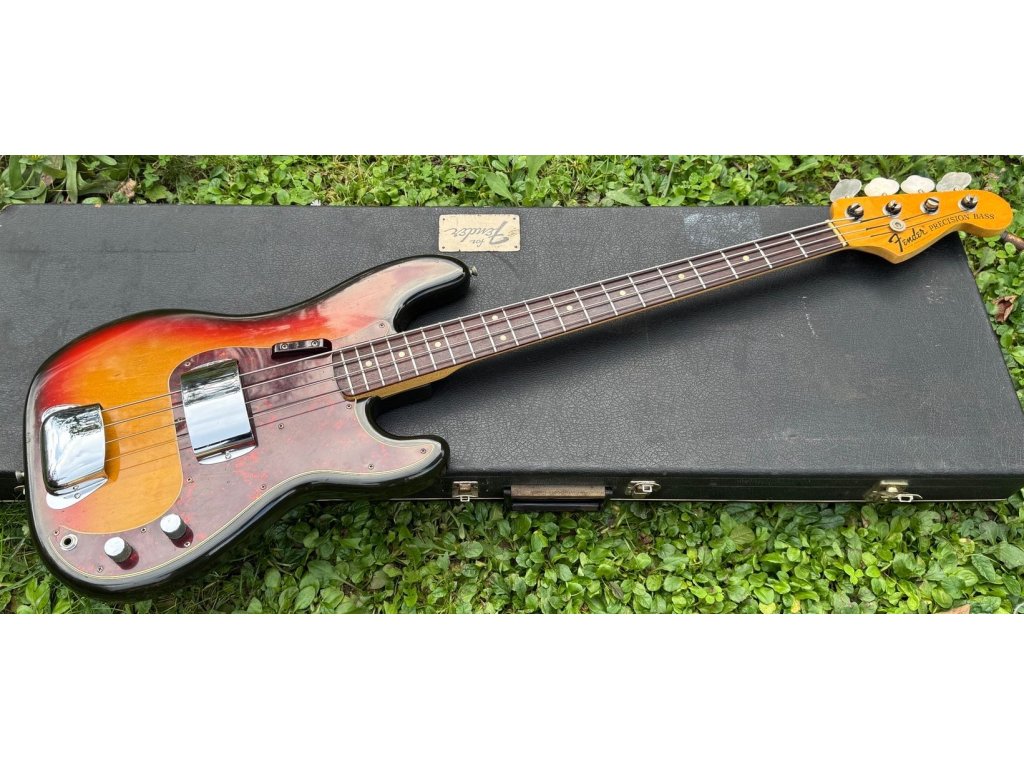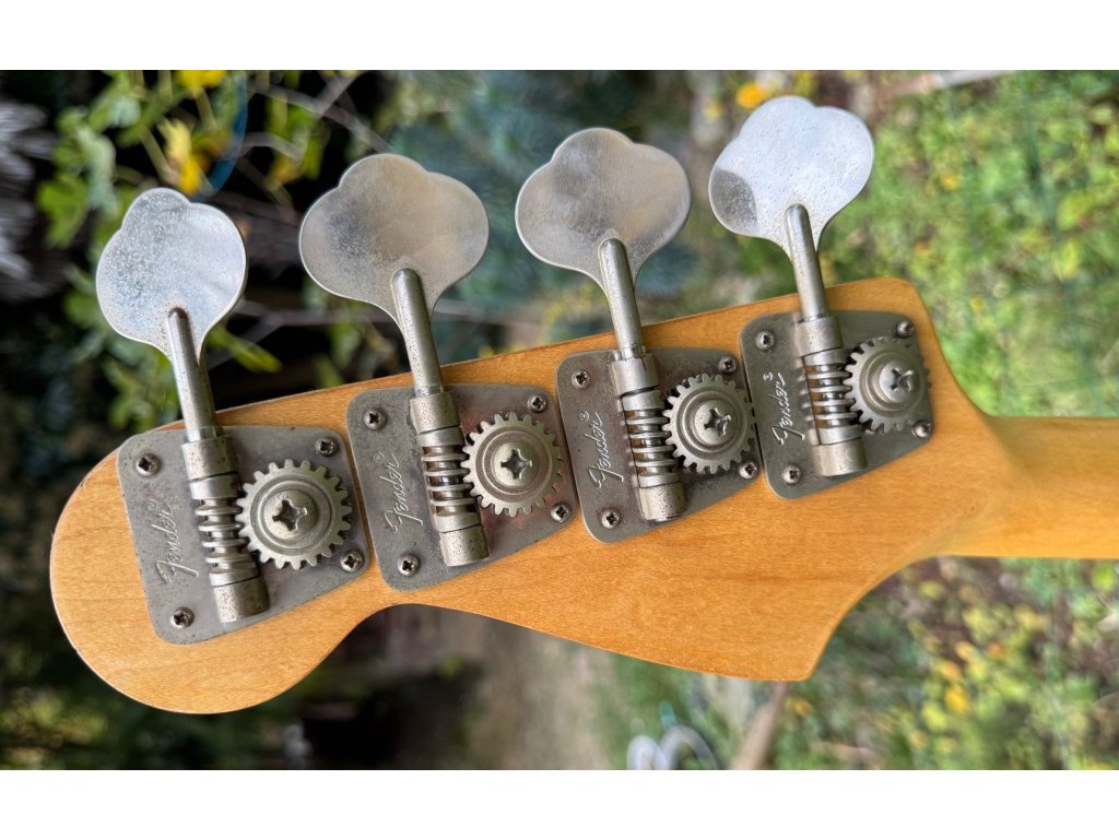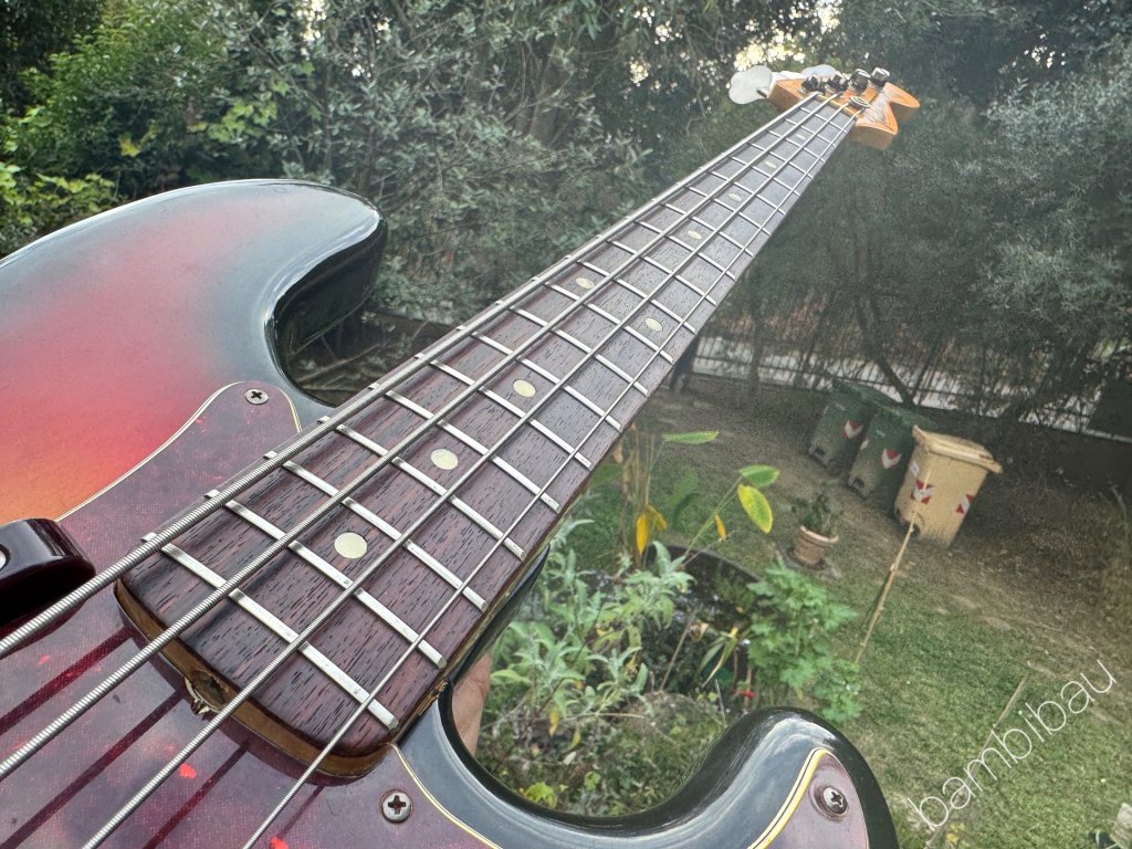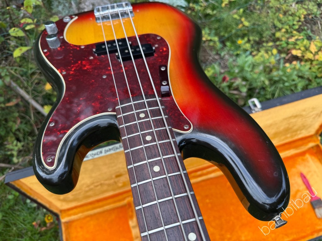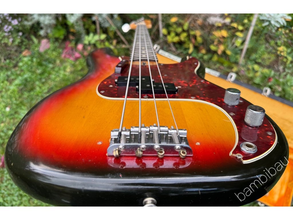 Fender Precision Bass z roku 1974 v krásném, původním stavu. Barva sunburst, rosewood neck, dokonce i plechové kryty se dochovaly. Basa je v nádherném stavu, neomlácená, jen pár drobných ranek, váží krásných 3,9 kg. Je profesionálně seřízená a hraje skvěle. V ceně je originál export case.